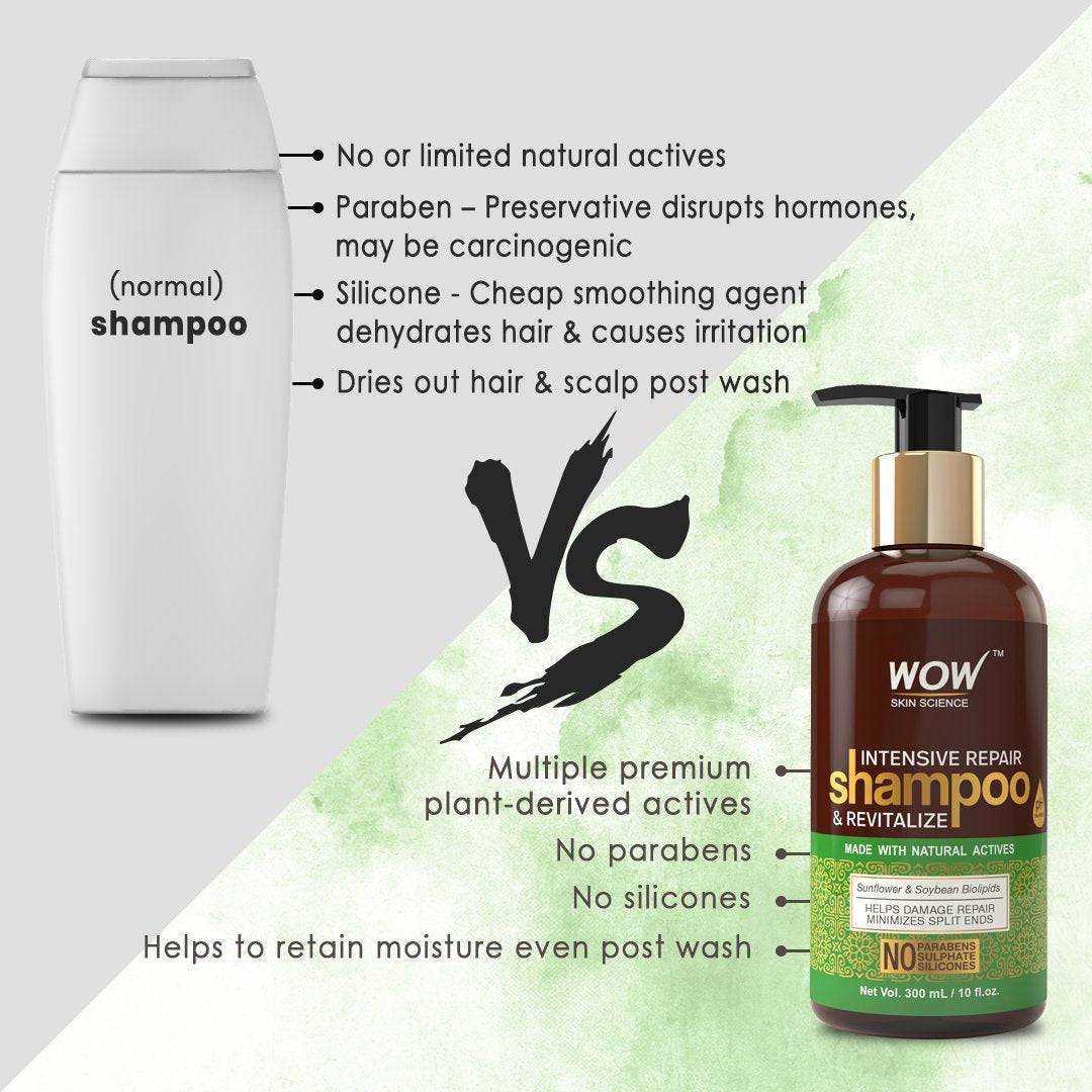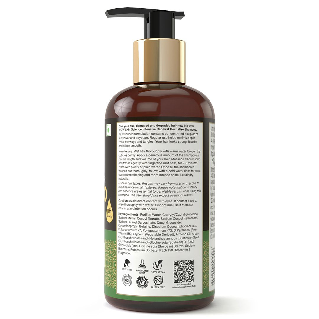 WOW Skin Science Intensive Repair & Revitalize Shampoo is a premium shampoo that helps repair & revitalize dull, damaged & degraded hair that's severely damaged by dyes, heat, chemicals, pollutants & sun exposure.