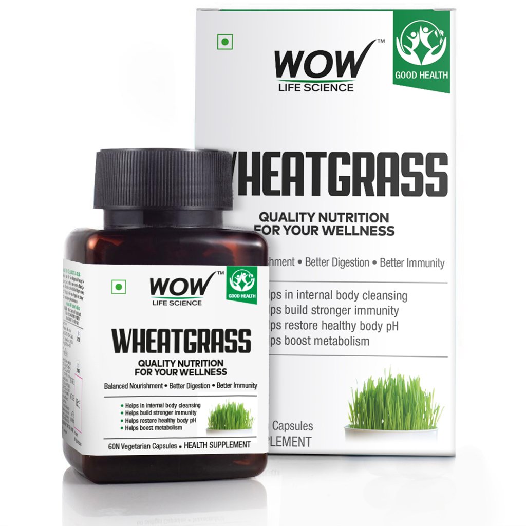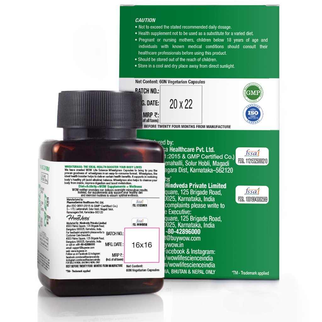 WOW Life Science Wheatgrass Dietary Supplement contains 60 capsules per pack.