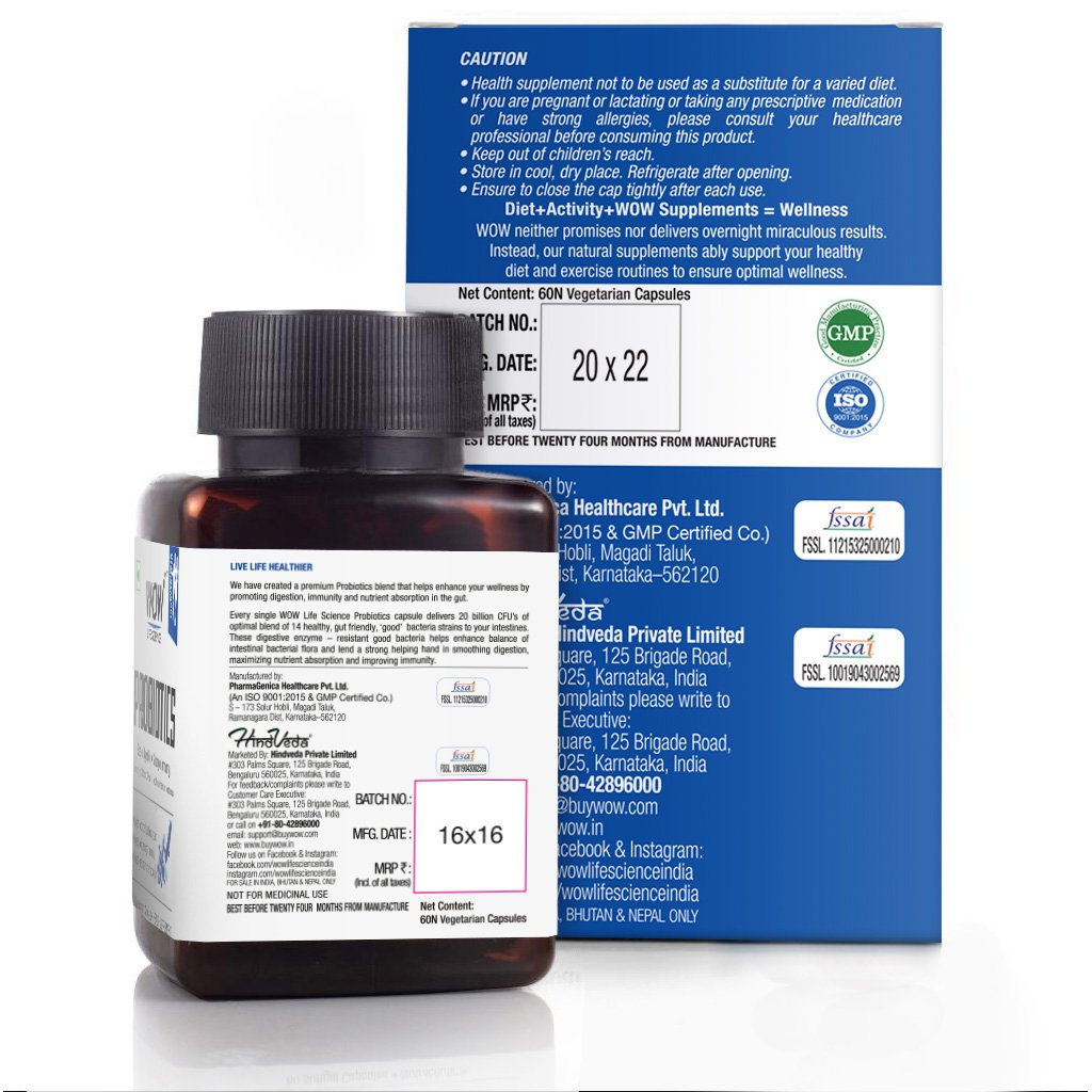 Probiotic bacteria - WOW Life Science Probiotic Dietary Supplement contains a blend of 14 'good' bacteria: L. plantarum, L. fermentum, L. acidophilus, B. infantis, L. casei, L. rhamnosus, B. lactis, L. reuteri, L.salivarius, L. paracasei, L. gasseri, S. thermophilus, B. bifidum & B. breve. Probiotic bacteria are the 'good' or the healthy bacteria that are resistant to the digestive enzymes, live inside the gut and aid healthy digestion and nutrient absorption.