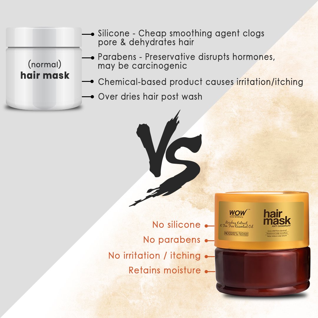 WOW Skin Science Anti-Dandruff Hair Mask's advanced formulation has Rosebay Extract to rebalance scalp's microflora, reduce oiliness of scalp and regulate scalp's inflammatory response to slay Malassezia, the dandruff causing fungus. It also has Tea Tree Essential Oil, nature's very own anti-fungal remedy, that helps neutralize fungus on scalp. It has Hydrolyzed Wheat Protein to help repair damaged hair and Moroccan Argan Oil to add shine and bounce. This hair mask works by boosting scalp health and cutting out itching, irritation and allergies.