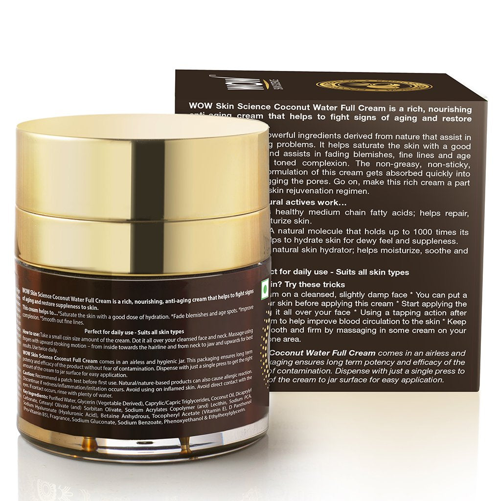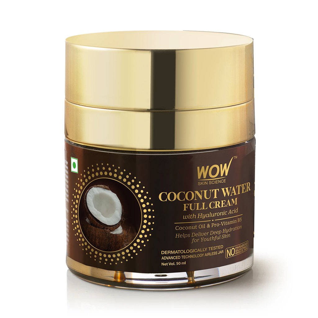 Give your skin its daily dose of anti-ageing nourishment with WOW Skin Science Coconut Water-Full Cream With Hyaluronic Acid. It is enriched with pure Coconut Water, Hyaluronic Acid and Pro-Vitamin B5 that help deal with skin ageing issues. Coconut water is a natural skin superfood loaded with healthy vitamins, antioxidants and minerals. It helps to saturate the skin with deep hydration. It diminishes blemishes and age spots for a more even-toned complexion. Hyaluronic Acid is a natural molecule that holds up to 1000 times its weight in water to keep your skin looking dewy fresh, firm and supple. Pro-Vitamin B5 helps to soothe irritated and sensitive skin, repairs skin damage and boost natural radiance. Coconut oil delivers essential fatty acids to the skin that softens the skin and protects the natural lipid barrier. The non-greasy, non-sticky, non-comedogenic formulation of this cream gets absorbed quickly into the skin without clogging the pores. Go on, make rich cream a part of your twice-a-day skin rejuvenation regimen.