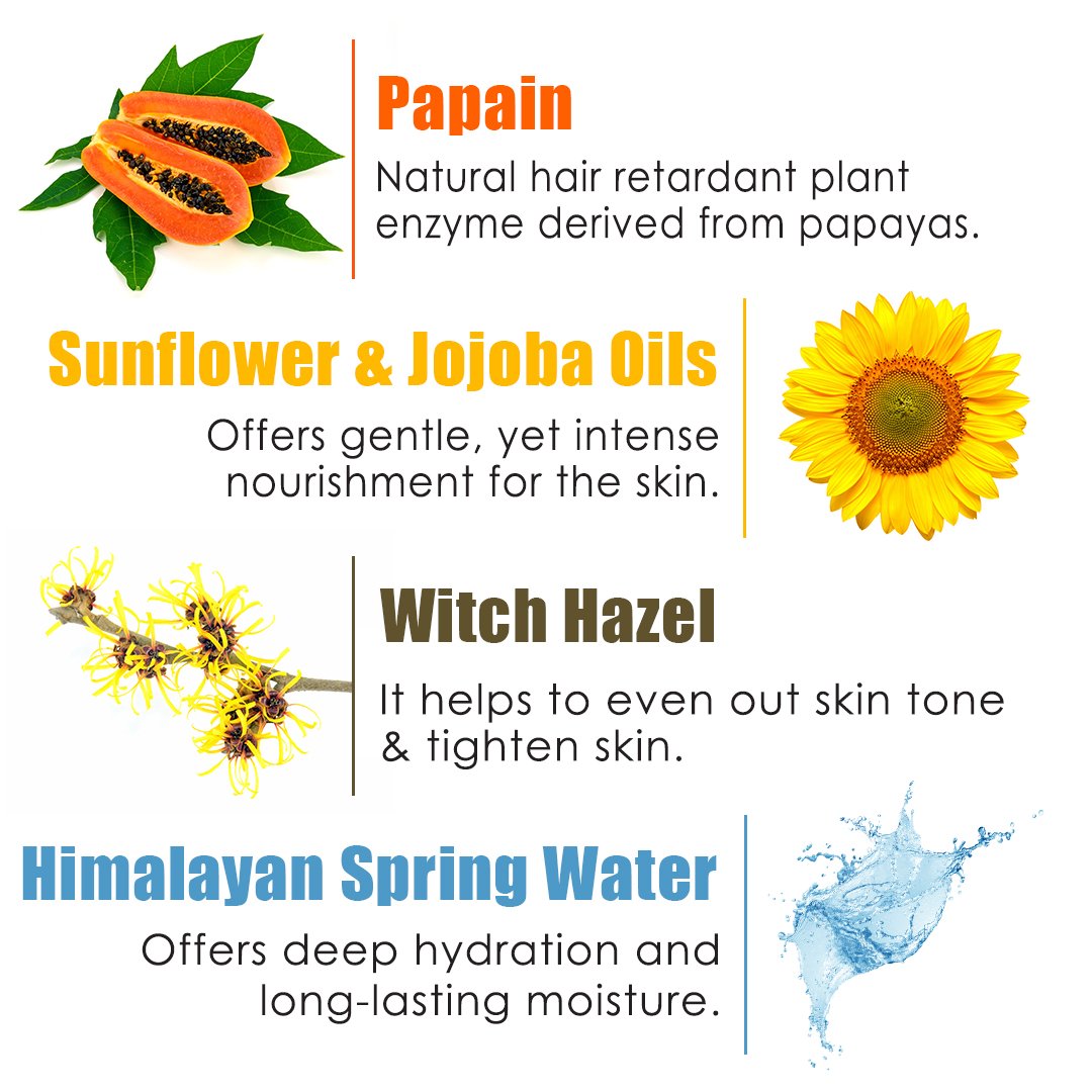 • Anti-hair and pro-skin active ingredients - papain and narcissus tazetta bulb extract - penetrate the skin to weaken the hair roots.