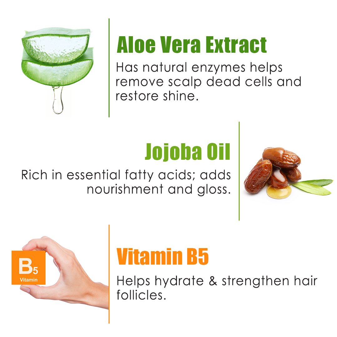 Aloe Vera Extract - Has natural enzymes helps remove scalp dead cells and restore shine.