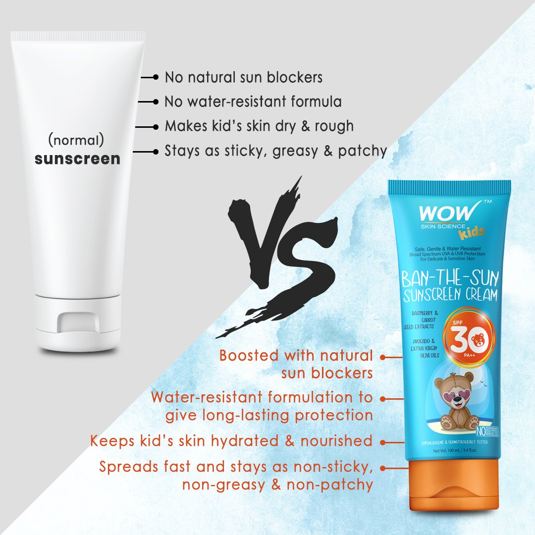 WOW Skin Science Kids Ban-The-Sun Sunscreen Cream, SPF 30 helps protect the child's delicate skin against harsh UV rays. Extracts of raspberry, carrot seed, avocado oil, and extra virgin olive oil help form a protective barrier on the child's skin. Skin stays moisturized, smooth and safe from the sun. Its non-oily, non-greasy, non-sticky and non-patchy formulation spreads evenly and gets absorbed quickly to form a protective shield over the exposed skin to save it from strong sunlight and its harmful UVA and UVB rays.