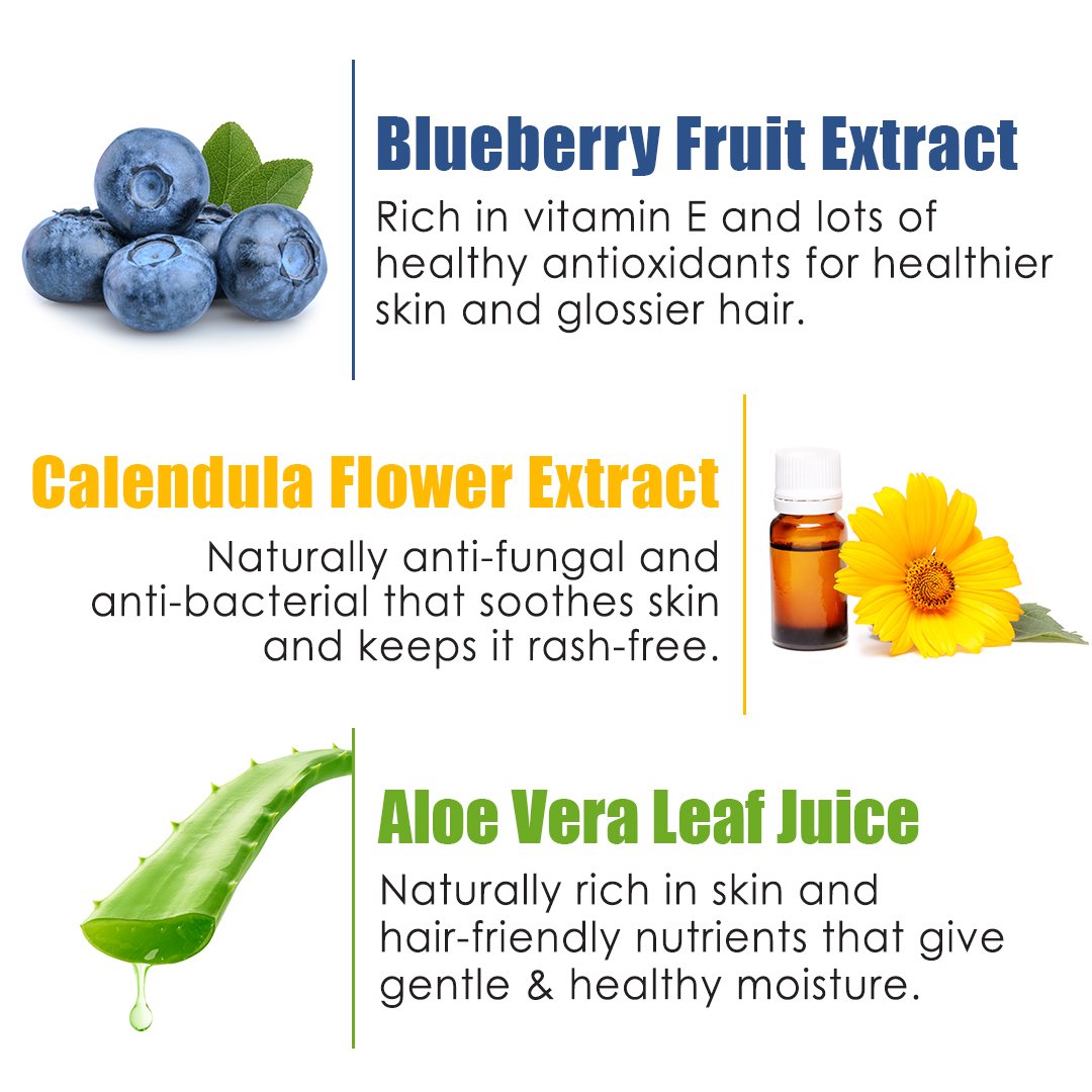Delectable blueberry fragrance that makes kids feel so much happier. Contains pure Blueberry Fruit Extract for natural and healthy skin and hair care.