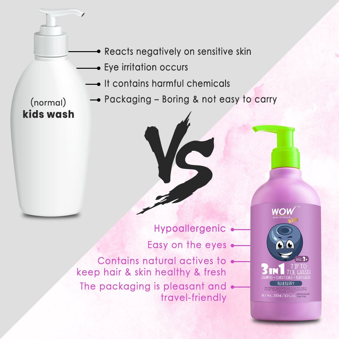 WOW Skin Science Kids 3-in-1 Blueberry Tip to Toe Wash is an all-in-one Shampoo, Conditioner & Body Wash for kids (age 3+). An amazing and totally delightful product that works as a shampoo, a conditioner and a body wash too. Formulated especially for kids, its bewitching blueberry fragrance combined with ultra-moisturizing rich, foaming lather makes your kids enjoy their bath hour without tantrums. As a bonus, it also leaves your child's skin and hair super clean, super soft and sweet smelling too. This dermatologist approved formula is also tear-free, easy on the eyes, hypoallergenic, skin friendly, and free of harsh chemicals like sulphate, parabens, mineral oil, PEG or silicones. 300 mL pump bottle.