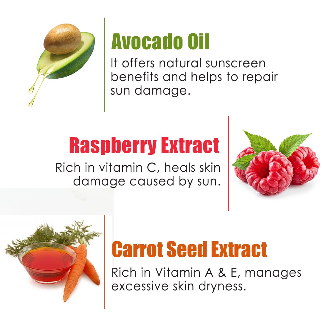 - With natural sun blockers - carrot seed & raspberry extracts, avocado oil, extra virgin olive oil.