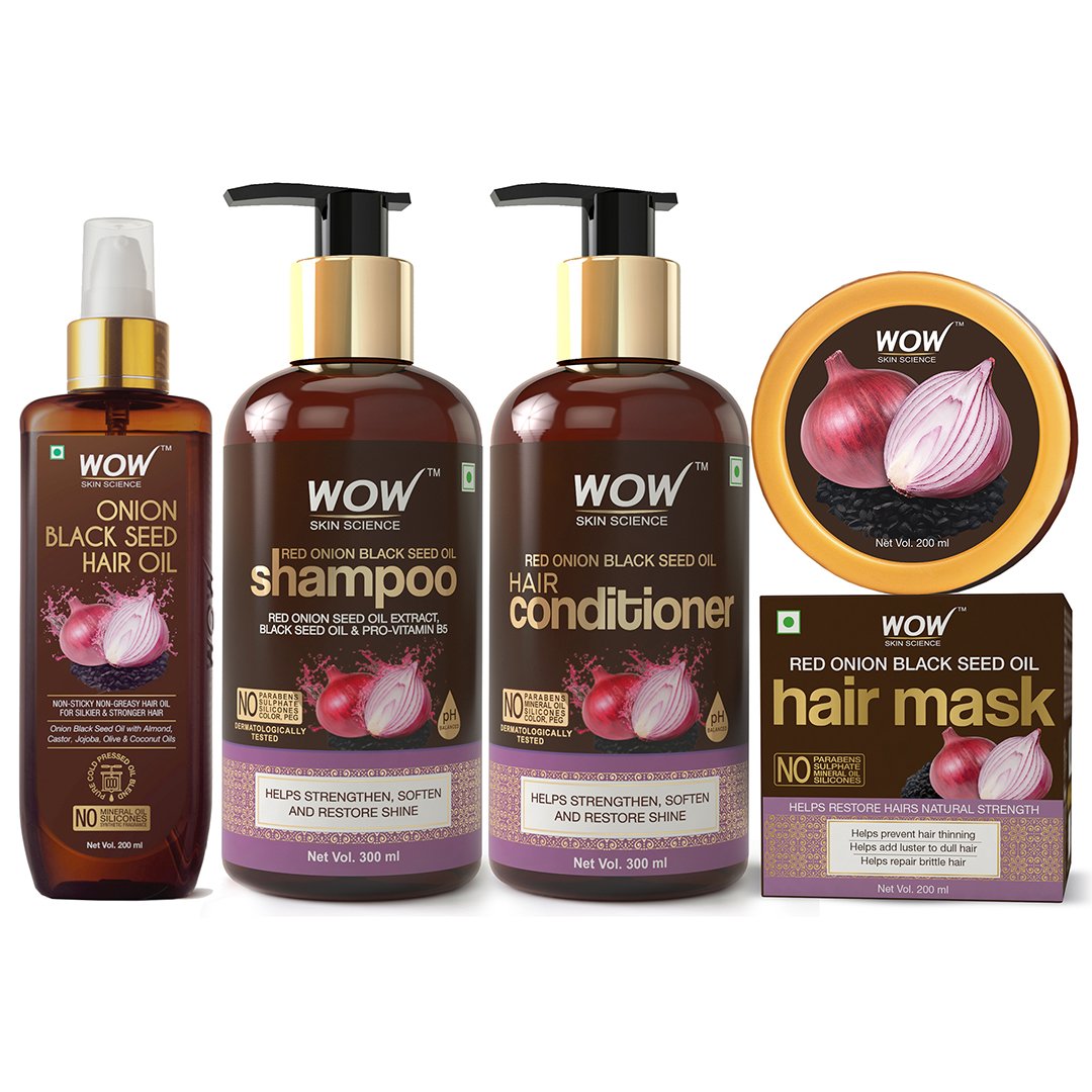 - Get strong and lustrous hair with WOW Skin Science Ultimate Onion Oil Hair Kit. This kit contains Onion Oil Shampoo, Onion Oil Conditioner, Onion Oil Hair Mask and Onion Hair Oil which helps to revive your tired scalp and hair.