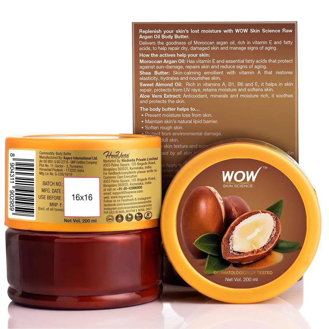 Replenish your skin’s lost moisture and restore healthy glow with WOW Skin Science Raw Argan Oil Body Butter. It delivers the goodness of Moroccan argan oil, rich in vitamin E and fatty acids, to help repair dry, damaged skin and manages signs of ageing. Often called ‘Liquid Gold’ for restoring skin, argan oil is extracted from the fruit kernels of the Argan Tree. It is rich in vitamin E and fatty acids that give skin a natural boost. This rich body butter also contains shea butter and sweet almond oil, rich in vitamins A B & E to support provide complete nourishment and gives smooth and soft skin. Aloe vera delivers deep hydration to help nourish and soften skin. It helps to brighten skin, and give it a smooth glow.