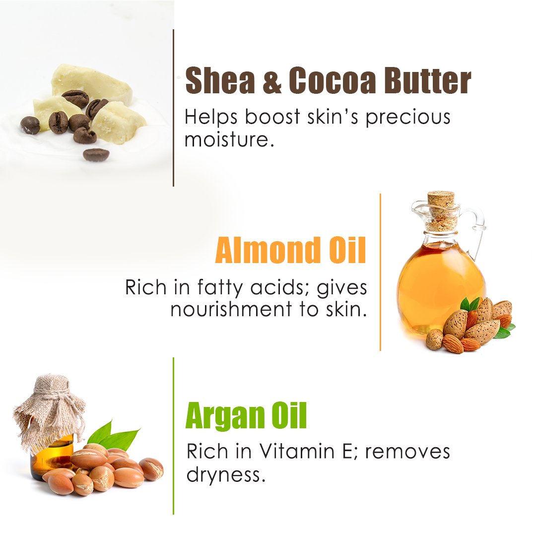 Enriched with the goodness of moisture rich shea butter and creamy cocoa butter.