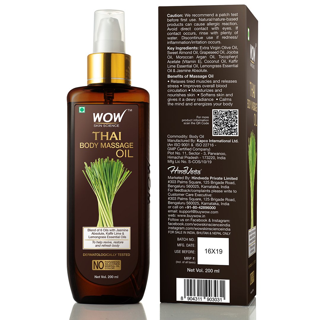 Rejuvenate your body and mind; keep skin healthy with WOW Skin Science Thai Body Massage Oil. This nutrient and vitamin enriched oil that helps to soothe your body and relieve stress. Delivers the goodness of 6 skin-smoothing oil blend infused with lemongrass, kaffir lime essential oils and jasmine absolute. It helps to restore youthful suppleness to your skin by protecting it from damage caused by free radicals. Massaging with this oil helps to strengthen the skin structure and helps to repair skin damage. The combination of essential nutrients, vitamin C and fatty acids helps to reduce dryness and skin irritations.