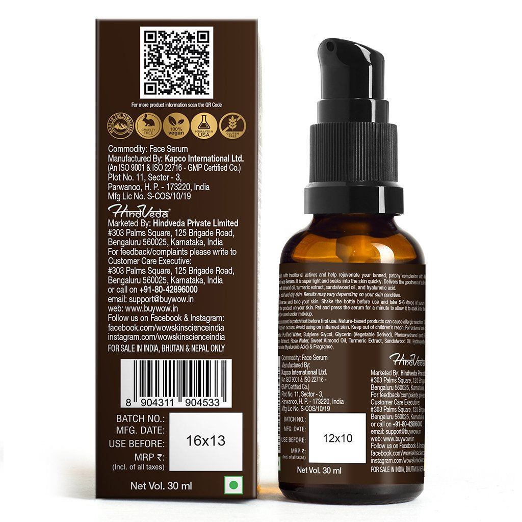 The serum is infused with saffron extract, rose water, sweet almond oil, turmeric extract, sandalwood oil, and hyaluronic acid. Saffron and Turmeric Extracts have skin-repairing and skin-brightening properties that enhance complexion and improve skin texture. Rose Water is a mineral-rich skin coolant and toner that tones the skin, smoothens skin, and gives it a soft glow. Hyaluronic Acid is a natural moisturizer that supports collagen structure. Sweet Almond Oil is rich in vitamin E, antioxidants, and essential fatty acids that keep skin moisturized and minimize fine lines; and Sandalwood Oil is an anti-irritation and skin calming activity that helps to remove skin imperfections, control excess oil, and soothe skin.