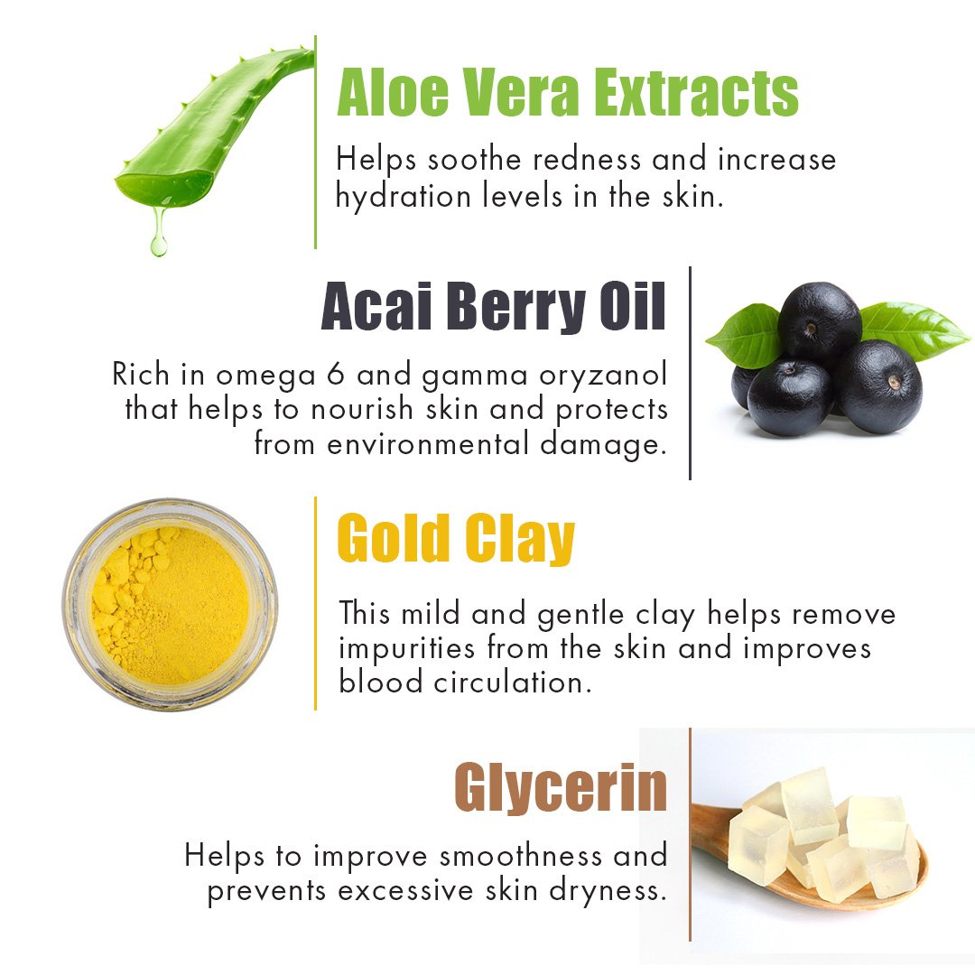 Purified Water, Sodium Lauroyl Sarcosinate, Cocamidopropyl Betaine, Disodium Cocoamphodiacetate, Polyacrylate - 33, Kaolin (Gold Clay), Glycerin (Vegetable Derived), Sodium Lactate, Sodium PCA, Aloe Vera Extract, Acai Berry (Euterpe Oleracea) Oil, Passion Fruit (Passiflora Incarnata) Oil, Rice Bran (Oryza Sativa) Oil, D Panthenol (Vitamin B5), Tocopheryl Acetate (Vitamin E), Allantoin, Sodium Benzoate, Phenoxyethanol & Ethylhexylglycerin, Sodium Gluconate & Fragrance.
